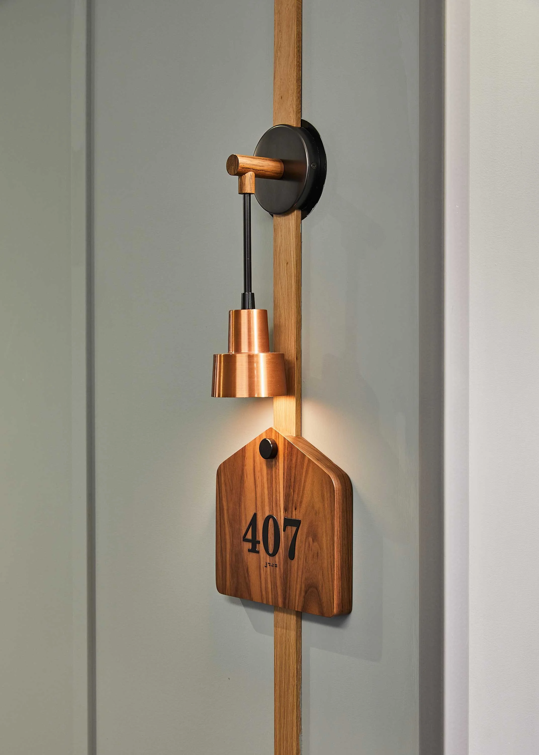 Distressed textile-based works by Fanny Allié in the elevator lobbies reference the city’s visual tapestry of diverse neighborhoods, integrating recycled garments to create 22 unique collages that evoke abstracted floor plans, figurative elements and landscapes of the surrounding area. This patchwork theme is mirrored in the corridors’ custom carpet by Sacco, which includes a series of patterns based on the Japanese shibori technique. Minimalist guest rooms feature elegant, space-saving millwork, and are layered with subtle allusions to local culture; colorful kayak paddles create a whimsical nod to the major rivers of Pennsylvania, while custom area rugs by Crosby Street Studios reference Quaker quilting patterns that complement artwork sourced by Soho Myriad Art Consulting. The bathrooms also capture shifting landscapes with the Terrains wallpaper by designer Jill Malek.